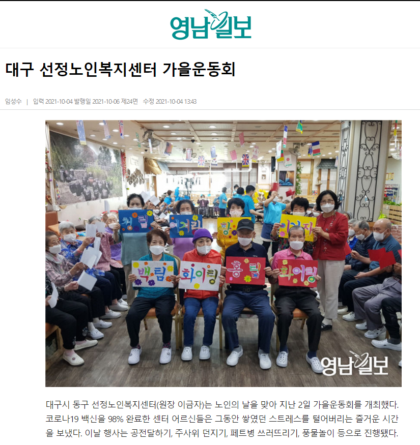 대구시 동구 선정노인복지센터(원장 이금자)는 노인의 날을 맞아 지난 2일 가을운동회를 개최했다. 코로나19 백신을 98% 완료한 센터 어르신들은 그동안 쌓였던 스트레스를 털어버리는 즐거운 시간을 보냈다. 이날 행사는 공전달하기, 주사위 던지기, 페트병 쓰러뜨리기, 풍물놀이 등으로 진행됐다.