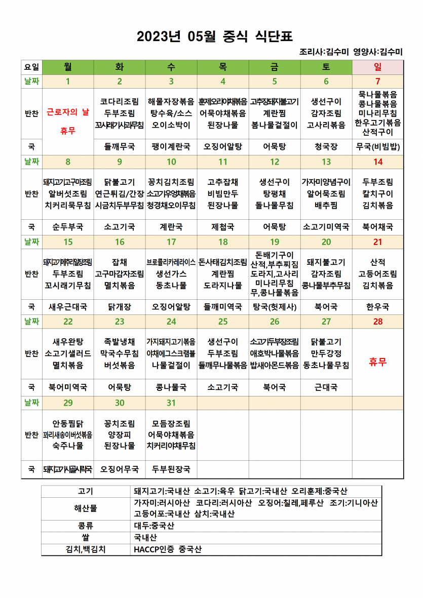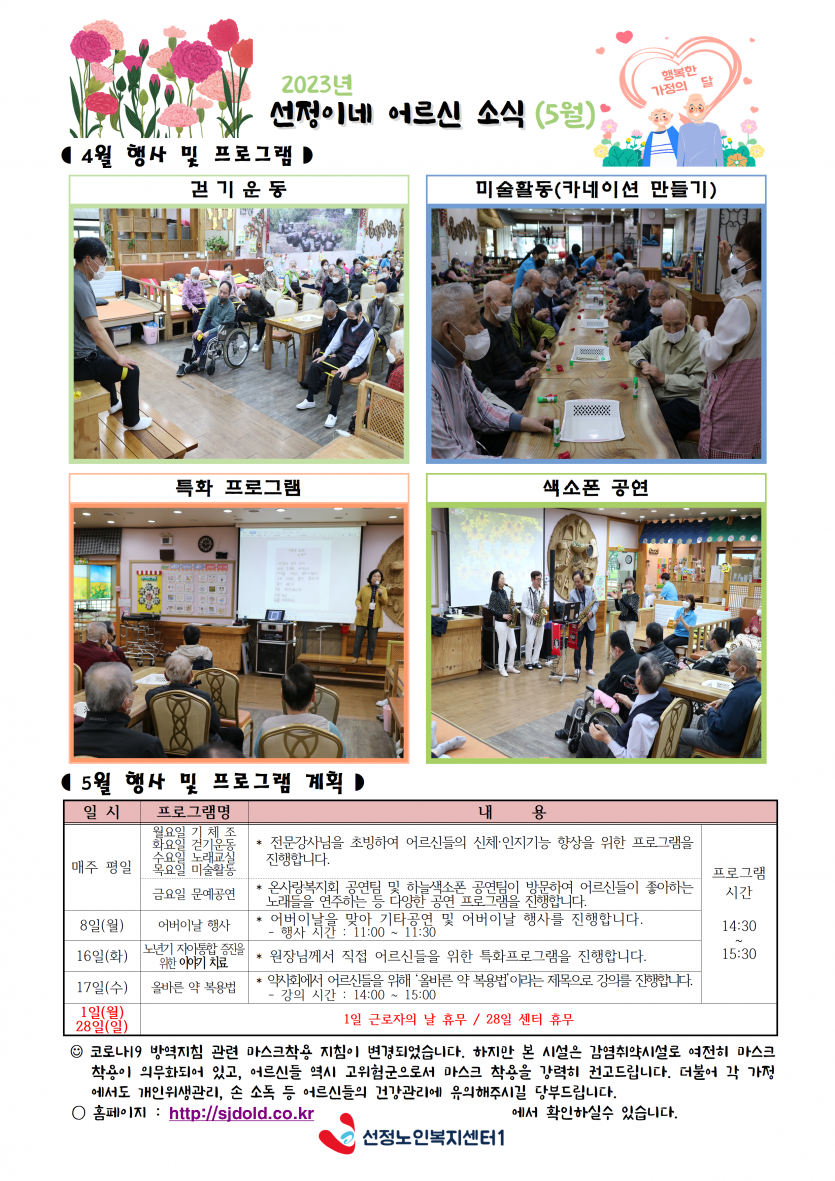 5월 소식지 및 식단표 페이지 정보 작성자 최고관리자 댓글 0건 조회 2,265회 작성일 23-05-02 19:39 본문 5월 소식지와 식단표 입니다. 목록 이전글5월 주야간보호 프로그램 일정표 23.05.02 다음글2023년 5월 휴무일 안내 23.05.02