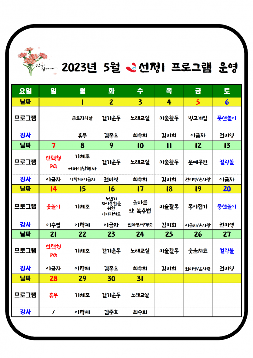 5월 주야간보호 프로그램 일정표 페이지 정보 작성자 최고관리자 댓글 0건 조회 2,235회 작성일 23-05-02 19:43 본문 5월 주야간보호 프로그램 일정표 입니다. 목록 이전글5월 치매전담실 프로그램 일정표 23.05.11 다음글5월 소식지 및 식단표 23.05.02