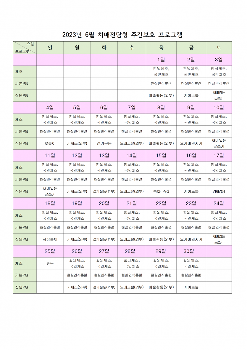 6월 치매전담실 프로그램 일정표 페이지 정보 작성자 최고관리자 댓글 0건 조회 2,203회 작성일 23-06-05 11:04 본문 6월 치매전담실 프로그램 일정표 입니다. 목록 이전글◆ 6월 24일 (토) ◆ 2023년도 상반기 보호자 회의를 개최합니다. 23.06.21 다음글6월 주야간보호 프로그램 일정표 23.06.05
