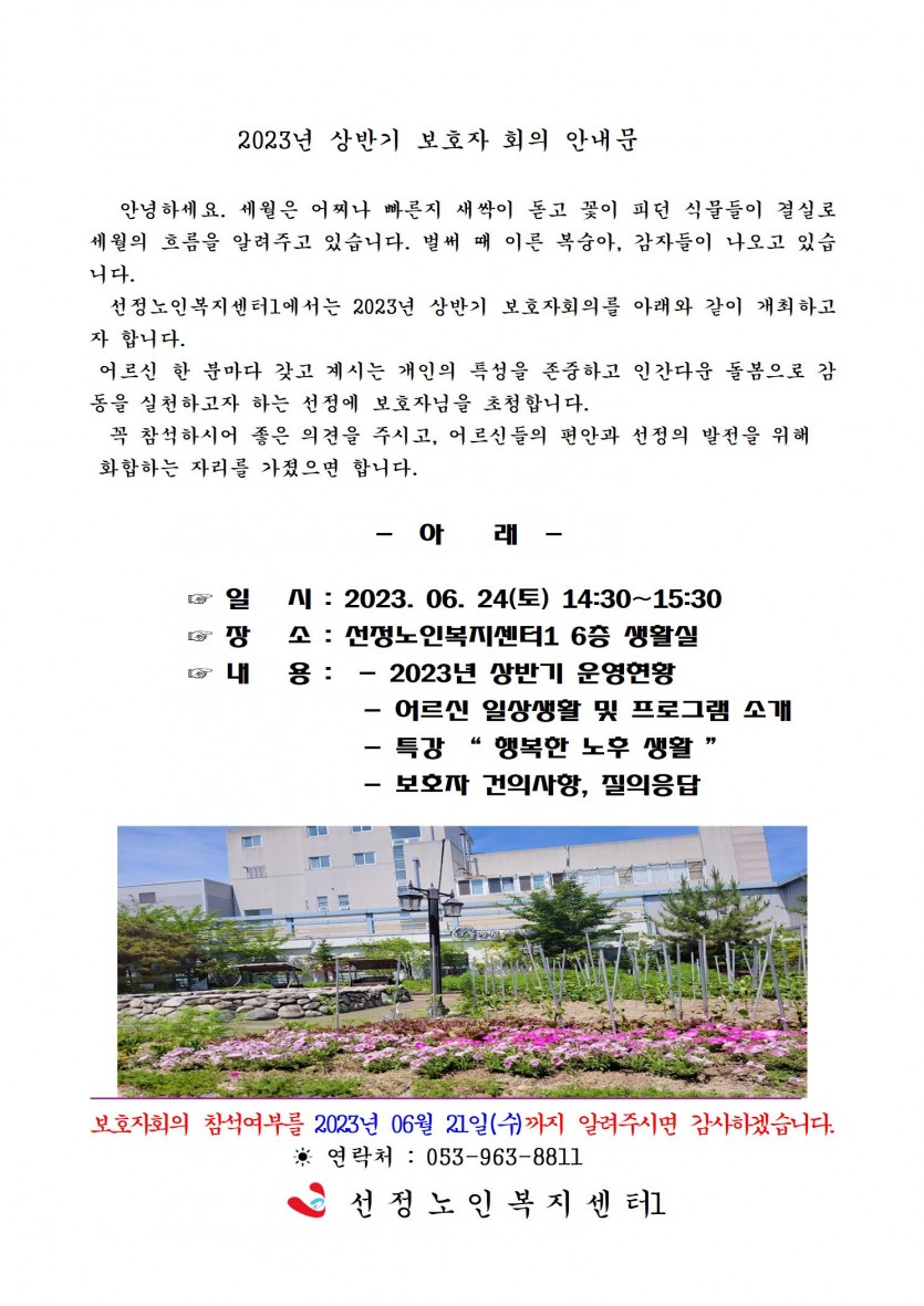 선정노인복지센터1에서는 2023년 상반기 보호자회의를 아래와 같이 개최하고자 합니다.