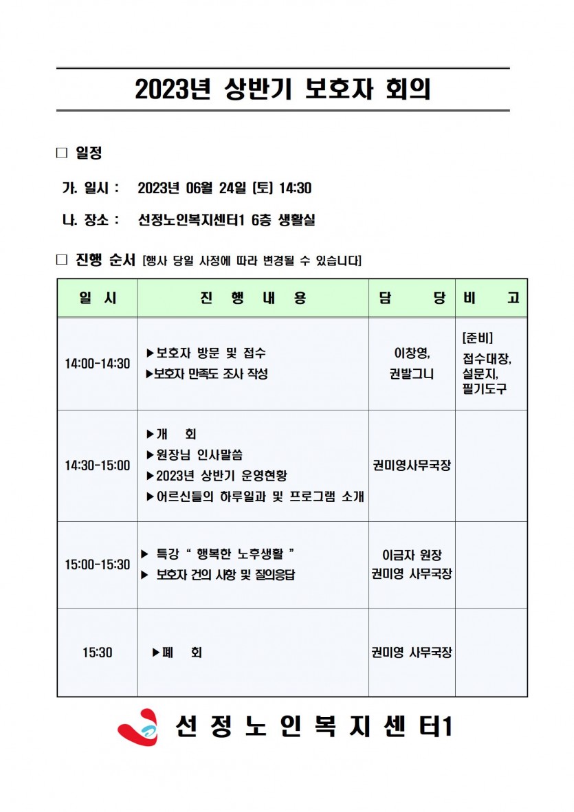 - 내용 : 2023년 상반기 운영현황 / 어르신 일상생활 및 프로그램 소개 / 특강 "행복한 노후 생활" 보호자 건의사항, 질의응답