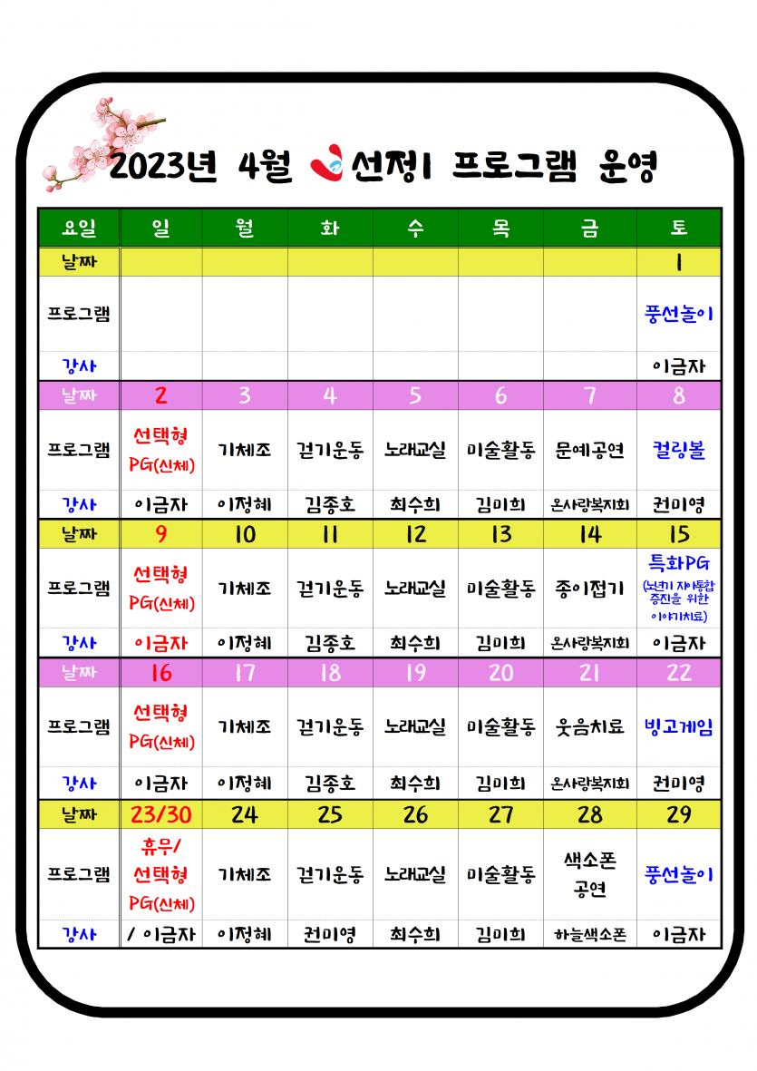 4월 주야간보호 프로그램 일정표 페이지 정보 작성자 최고관리자 댓글 0건 조회 2,429회 작성일 23-04-03 18:23 본문 4월 주야간보호 프로그램 일정표 입니다. 목록 이전글4월 치매전담실 프로그램 일정표 23.04.03 다음글4월 소식지 및 식단표 23.04.03