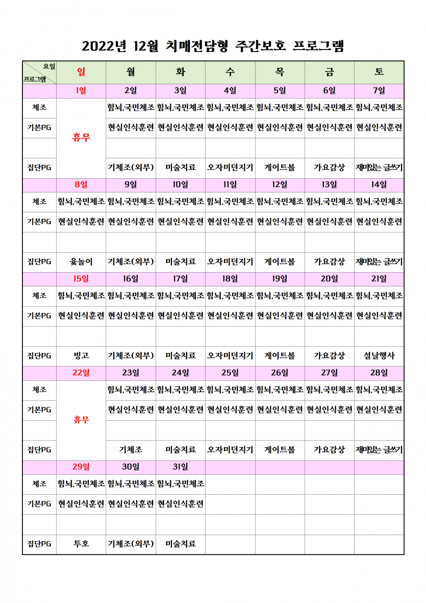2023년 1월 치매전담실 프로그램 일정표 페이지 정보 작성자 최고관리자 댓글 0건 조회 2,562회 작성일 23-01-03 15:10 본문 2023년 1월 치매전담실 프로그램 일정표 입니다. 목록 이전글2023년 2월 휴무일 안내 23.01.30 다음글2023년 1월 주야간보호 프로그램 일정표 23.01.03