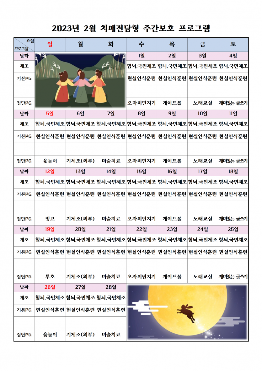 2월 치매전담실 프로그램 일정표 페이지 정보 작성자 최고관리자 댓글 0건 조회 2,421회 작성일 23-02-01 14:53 본문 2월 치매전담실 프로그램 일정표 입니다. 목록 이전글2023년 3월 휴무일 안내 23.02.24 다음글2월 주야간보호 프로그램 일정표 23.02.01