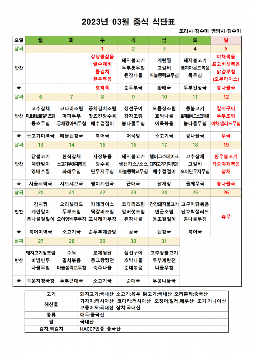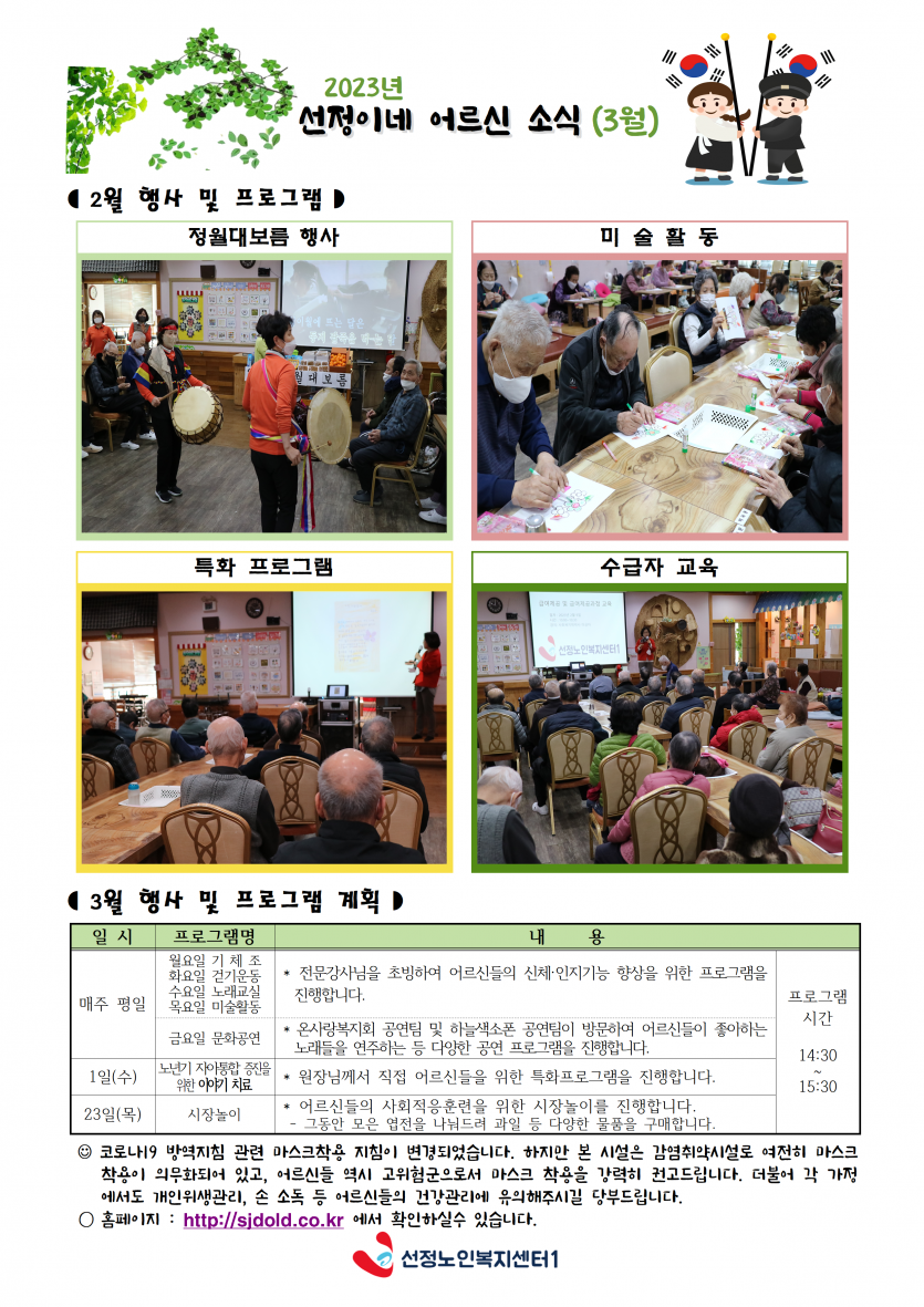 3월 소식지 및 식단표 페이지 정보 작성자 최고관리자 댓글 0건 조회 2,352회 작성일 23-03-03 19:20 본문 3월 소식지 및 식단표 입니다. 목록 이전글3월 주야간보호 프로그램 일정표 23.03.03 다음글2023년 3월 휴무일 안내 23.02.24