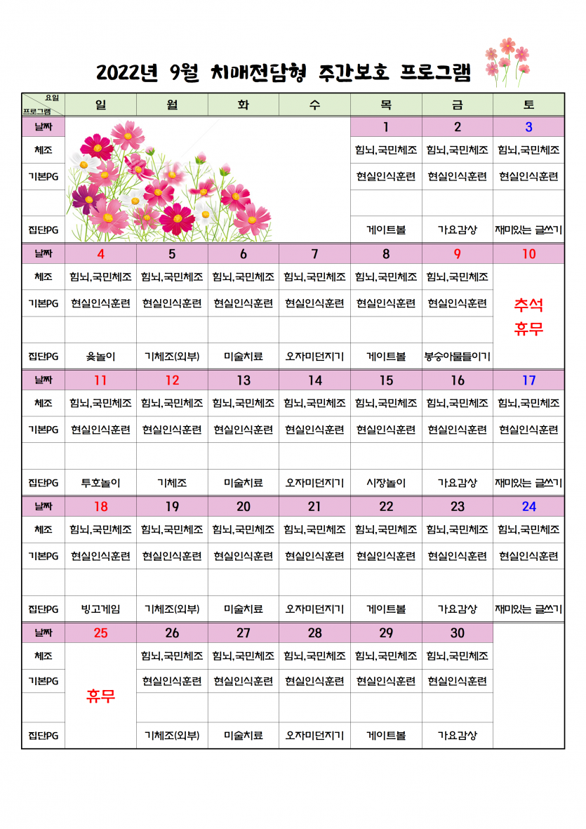 9월 치매전담실 프로그램 운영표 페이지 정보 작성자 최고관리자 댓글 0건 조회 2,481회 작성일 22-09-01 11:22 본문 9월 치매전담실 프로그램 운영표입니다. 목록 이전글10월 휴무일 안내 22.09.30 다음글9월 주야간보호 프로그램 운영표 22.08.31
