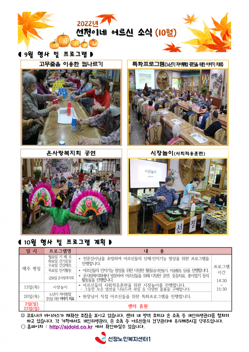 10월 소식지 및 식단표 페이지 정보 작성자 최고관리자 댓글 0건 조회 2,426회 작성일 22-10-03 14:16 본문 10월 소식지와 식단표 올립니다. 참고하시기 바랍니다. 목록 이전글10월 주야간보호 프로그램 일정표 22.10.03 다음글10월 휴무일 안내 22.09.30