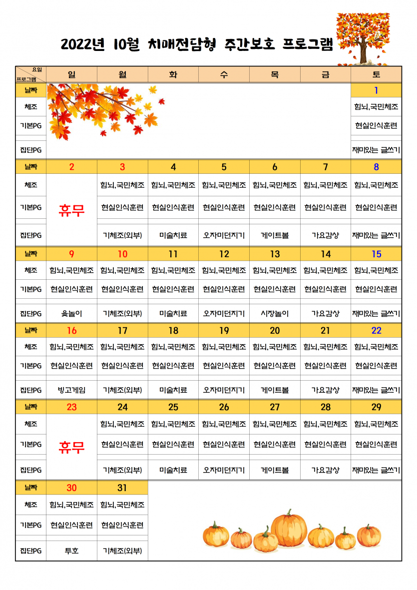 10월 치매전담실 프로그램 일정표 페이지 정보 작성자 최고관리자 댓글 0건 조회 2,546회 작성일 22-10-03 14:46 본문 프로그램 일정표 입니다. 목록 이전글11월 휴무일 안내 22.10.26 다음글10월 주야간보호 프로그램 일정표 22.10.03