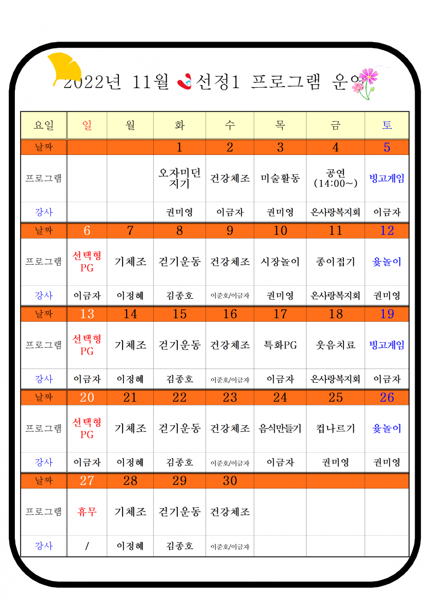11월 주야간보호 프로그램 일정표 페이지 정보 작성자 최고관리자 댓글 0건 조회 2,604회 작성일 22-11-01 16:49 본문 11월 주야간보호 프로그램 일정표 입니다. 목록 이전글11월 치매전담실 프로그램 일정표 22.11.01 다음글11월 소식지 및 식단표 22.11.01