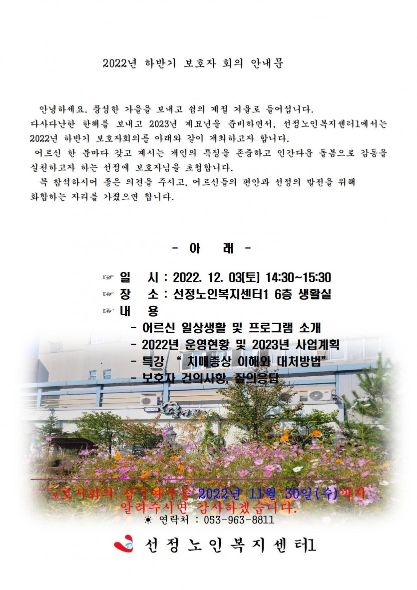 ◆ 12월 3일 (토) ◆ 2022년도 하반기 보호자 회의를 개최합니다.