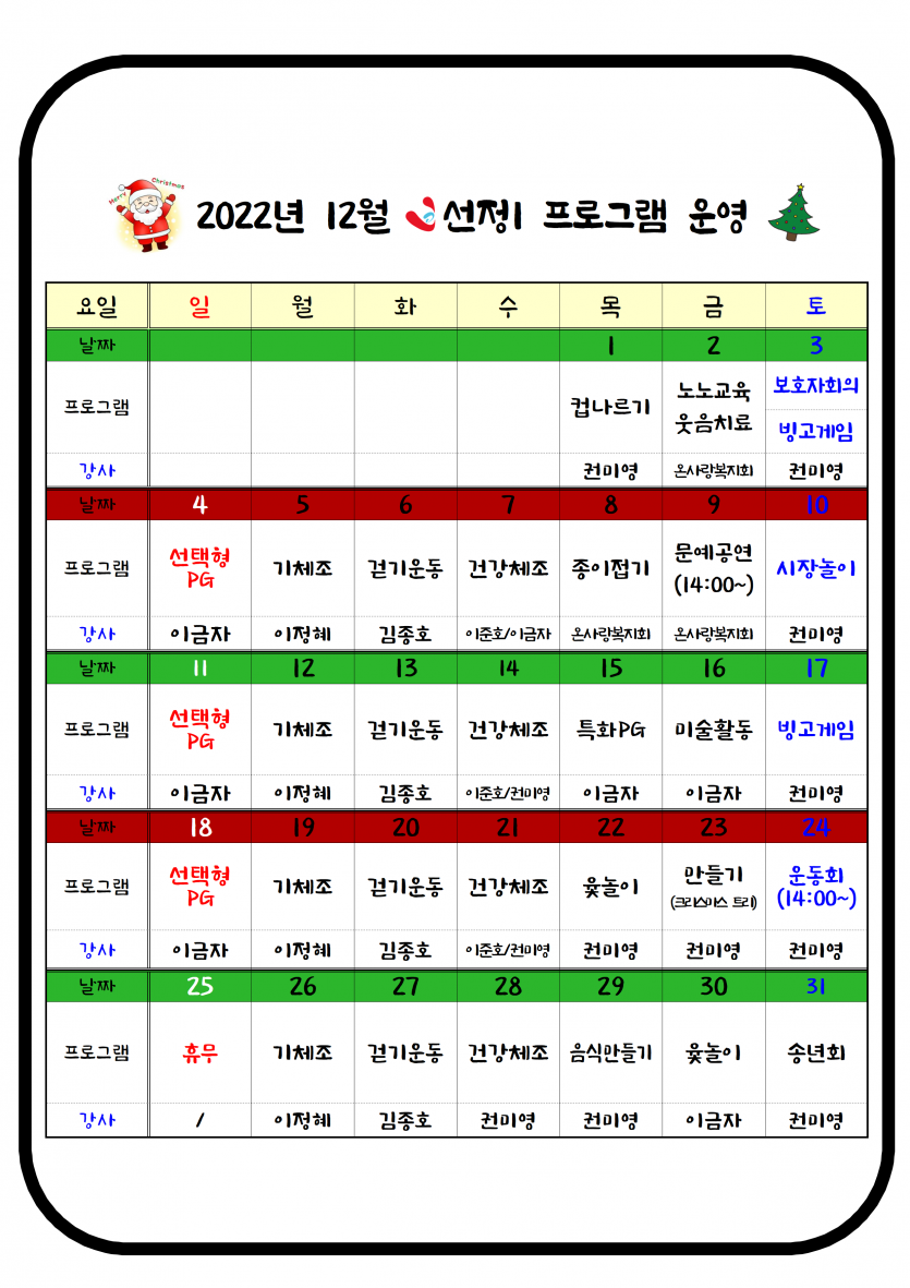 12월 주야간보호 프로그램 일정표 페이지 정보 작성자 최고관리자 댓글 0건 조회 2,497회 작성일 22-12-01 11:32 본문 12월 주야간보호 프로그램 일정표 입니다. 목록 이전글12월 치매전담실 프로그램 일정표 22.12.01 다음글12월 소식지 및 식단표 22.12.01