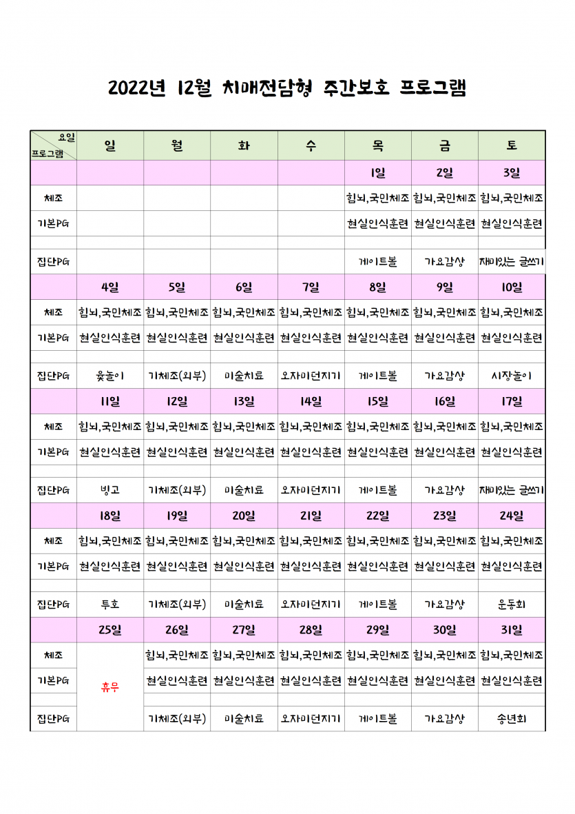 12월 치매전담실 프로그램 일정표 페이지 정보 작성자 최고관리자 댓글 0건 조회 2,442회 작성일 22-12-01 13:46 본문 12월 치매전담실 프로그램 일정표 입니다. 목록 이전글2023년 1월 휴무일 안내 22.12.29 다음글12월 주야간보호 프로그램 일정표 22.12.01