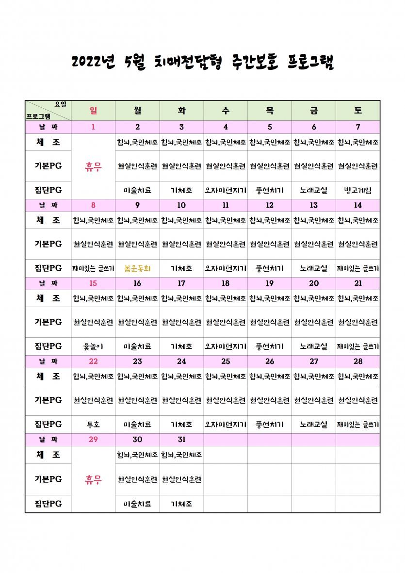 5월 치매전담실 프로그램 운영표 페이지 정보 작성자 최고관리자 댓글 0건 조회 2,343회 작성일 22-05-02 13:30 본문 5월 치매전담실 프로그램 운영표 입니다. 목록 이전글6월 휴무일 안내 22.06.03 다음글5월 주야간보호 프로그램 운영표 22.05.02