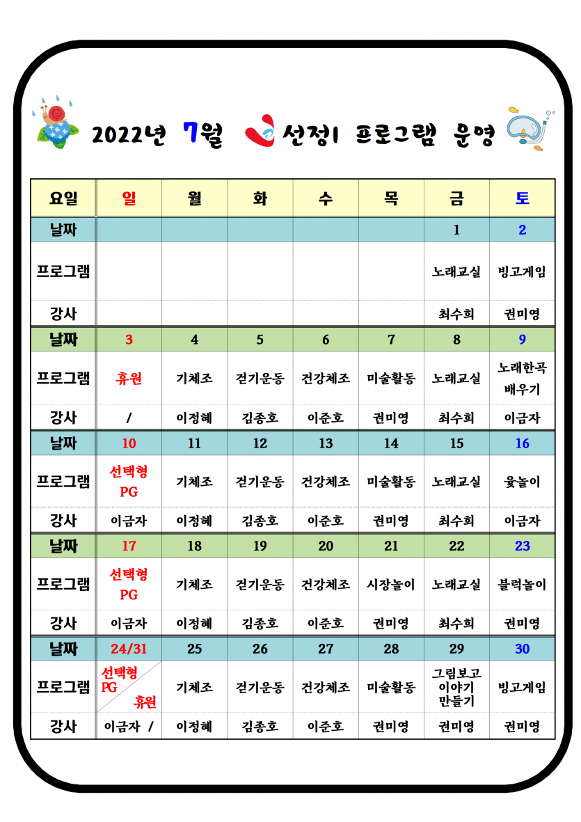 7월 주야간보호 프로그램 운영표 페이지 정보 작성자 최고관리자 댓글 0건 조회 2,376회 작성일 22-06-30 19:33 본문 7월 주야간보호 프로그램 운영표 입니다. 목록 이전글7월 치매전담실 프로그램 운영표 22.07.05 다음글7월 소식지 및 식단표 22.06.30