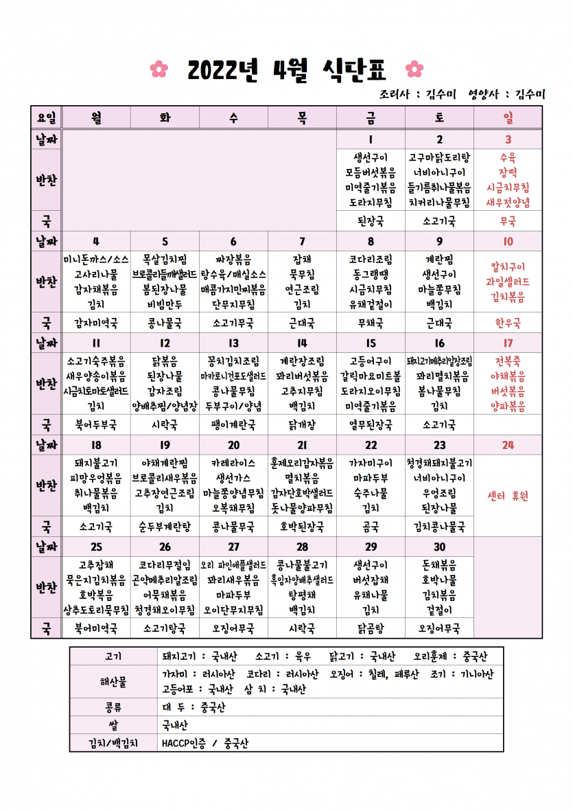 4월 소식지 및 식단표 페이지 정보 작성자 최고관리자 댓글 0건 조회 2,283회 작성일 22-04-01 14:24 본문 4월 소식지와 식단표 입니다. 목록 이전글4월 치매전담실 프로그램 운영표 22.04.01 다음글4월 휴무일 안내 22.03.31