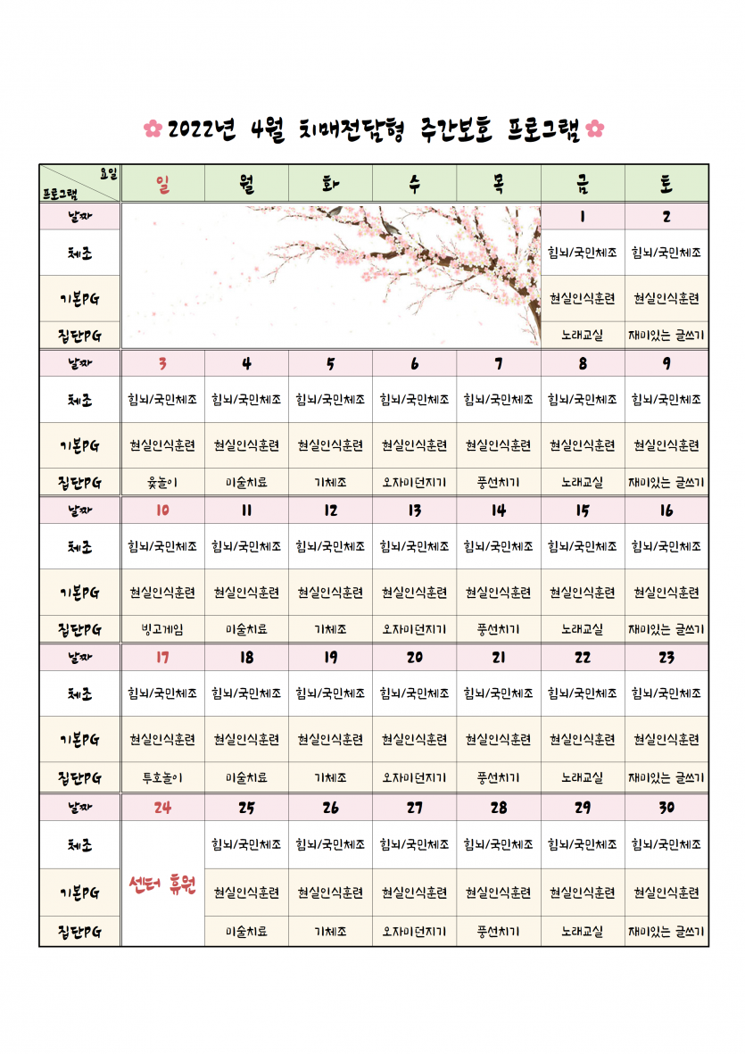 4월 치매전담실 프로그램 운영표 페이지 정보 작성자 최고관리자 댓글 0건 조회 2,338회 작성일 22-04-01 14:25 본문 4월 치매전담실 프로그램 운영표 입니다. 목록 이전글4월 주야간보호 프로그램 운영표 22.04.01 다음글4월 소식지 및 식단표 22.04.01