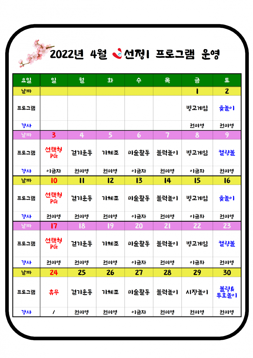 4월 주야간보호 프로그램 운영표 페이지 정보 작성자 최고관리자 댓글 0건 조회 2,322회 작성일 22-04-01 14:26 본문 4월 주야간보호 프로그램 운영표 입니다. 목록 이전글5월 휴무일 안내 22.04.29 다음글4월 치매전담실 프로그램 운영표 22.04.01