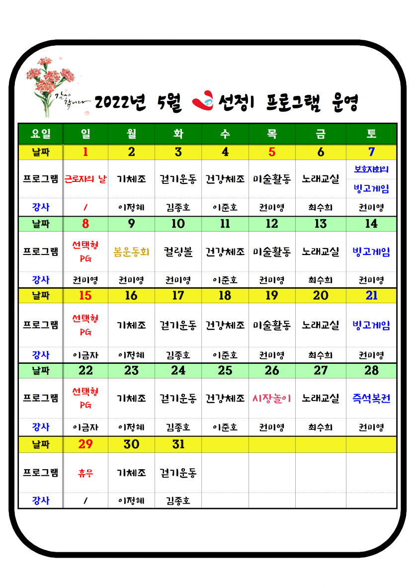 5월 주야간보호 프로그램 운영표 페이지 정보 작성자 최고관리자 댓글 0건 조회 2,345회 작성일 22-05-02 13:29 본문 5월 프로그램 운영표 입니다. 목록 이전글5월 치매전담실 프로그램 운영표 22.05.02 다음글5월 소식지 및 식단표 22.05.02
