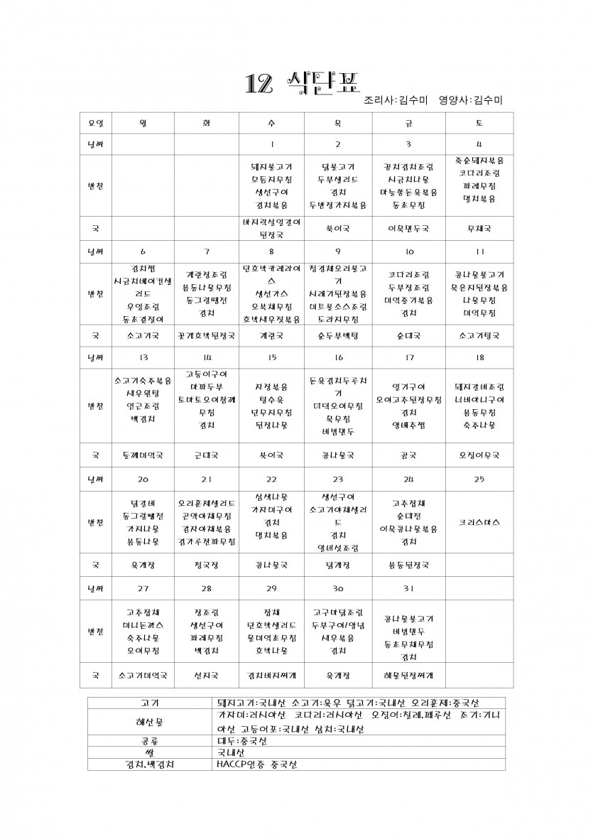 12월 소식지 및 식단표 페이지 정보 작성자 최고관리자 댓글 0건 조회 2,312회 작성일 21-12-01 18:18 본문 12월 소식지 및 식단표입니다! 목록 이전글12월 치매전담실 프로그램 운영표 21.12.01 다음글11월 주야간 보호 프로그램 운영표 21.11.22