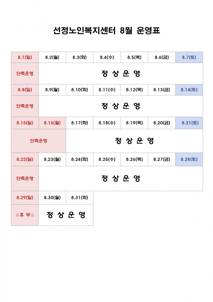 8월 운영 안내 페이지 정보 작성자 최고관리자 댓글 0건 조회 2,479회 작성일 21-07-31 11:19 본문 ■ 8월 16일(월) 단축운영 / 8월 29일(일) 센터 휴무 입니다. 목록 이전글8월 소식지 및 식단표 21.07.31 다음글7월 치매전담실 프로그램 운영표 21.06.29