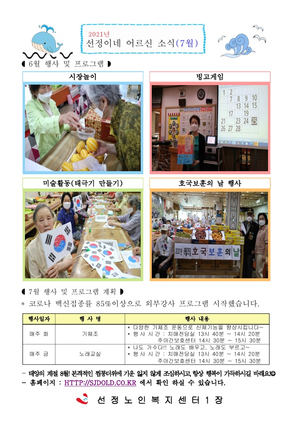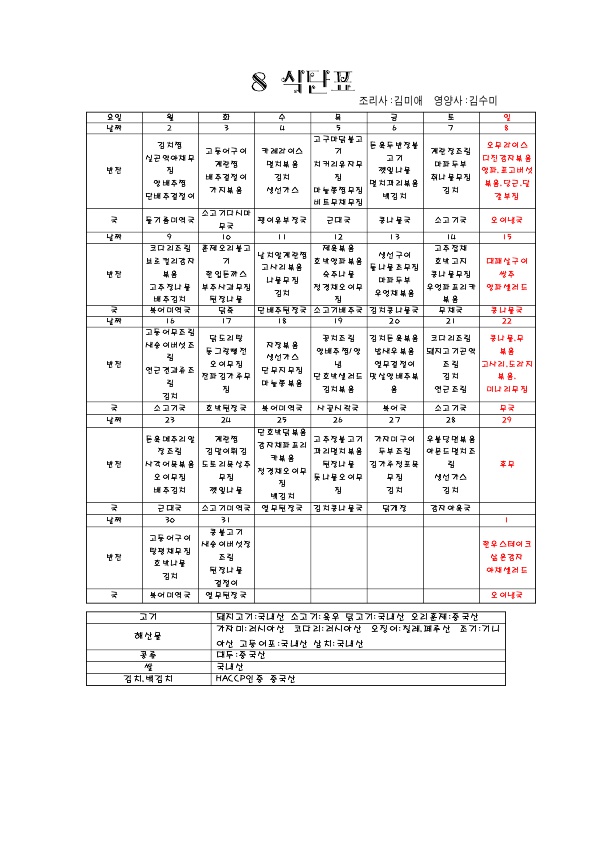 8월 소식지 및 식단표 페이지 정보 작성자 최고관리자 댓글 0건 조회 2,426회 작성일 21-07-31 11:20 본문 ■ 8월 소식지 및 식단표 입니다. 목록 이전글8월 치매전담실 프로그램 운영표 21.07.31 다음글8월 운영 안내 21.07.31