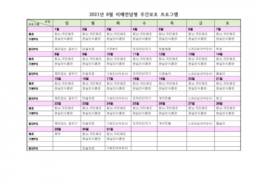 8월 치매전담실 프로그램 운영표 페이지 정보 작성자 최고관리자 댓글 0건 조회 2,442회 작성일 21-07-31 11:20 본문 ■ 8월 치매전담실 프로그램 운영표 입니다. 목록 이전글8월 주야간 보호 프로그램 운영표 21.07.31 다음글8월 소식지 및 식단표 21.07.31