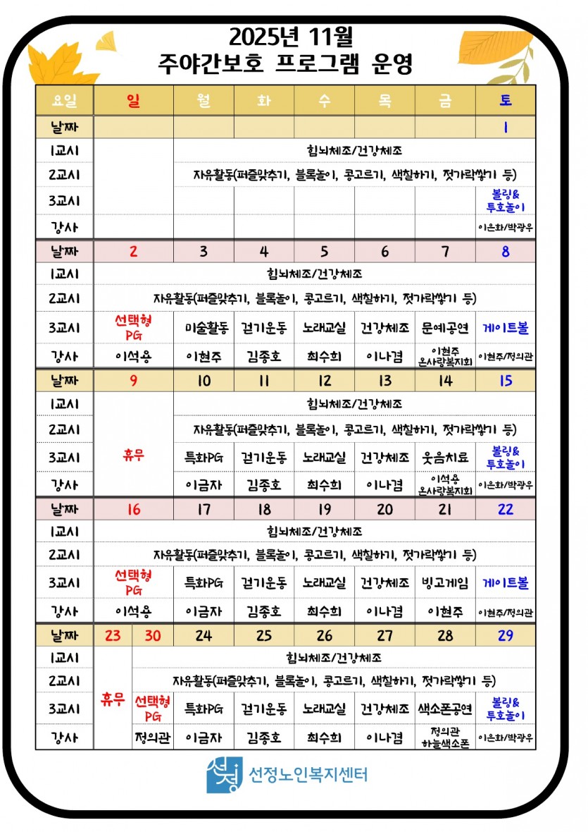 2025년 11월 주야간 프로그램 운영표 페이지 정보 작성자 최고관리자 댓글 0건 조회 318회 작성일 25-10-30 16:05 본문 * 2025년 11월 주야간 프로그램 운영표 입니다. 목록 이전글2025년 11월 치매전담실 프로그램 운영표 25.10.30 다음글2025년 11월 휴무일 안내 25.10.21