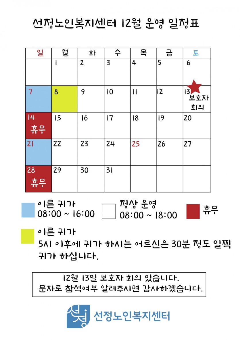 12월 8일은 센터 사정상 5시 이후에 댁에 도착하시는 어르신들은 30분 일찍 댁에 도착합니다.