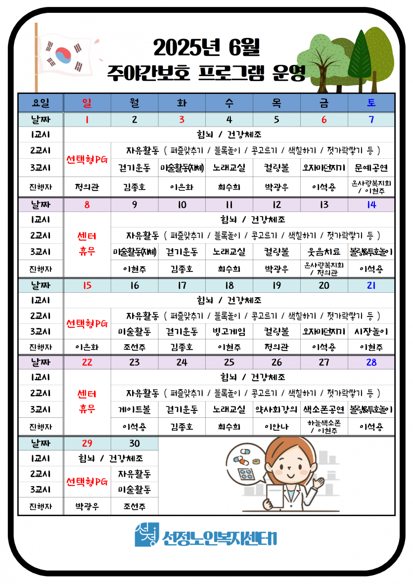 2025년 6월 주야간보호 프로그램 일정표 페이지 정보 작성자 최고관리자 댓글 0건 조회 606회 작성일 25-05-30 19:24 본문 6월 주야간보호 프로그램 운영표 입니다 목록 이전글2025년 6월 치매전담실 프로그램 일정표 25.05.30 다음글2025년 6월 휴무일 안내 25.05.30