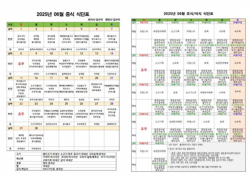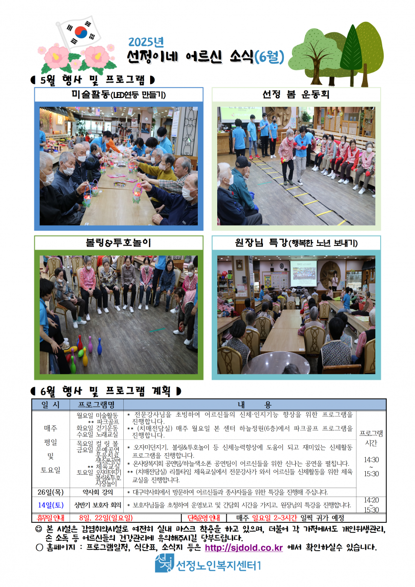 2025년 6월 소식지 및 식단표 페이지 정보 작성자 최고관리자 댓글 0건 조회 639회 작성일 25-05-30 19:25 본문 6월 소식지 및 식단표 입니다. 목록 이전글2025년 7월 휴무일 안내 25.07.01 다음글2025년 6월 치매전담실 프로그램 일정표 25.05.30