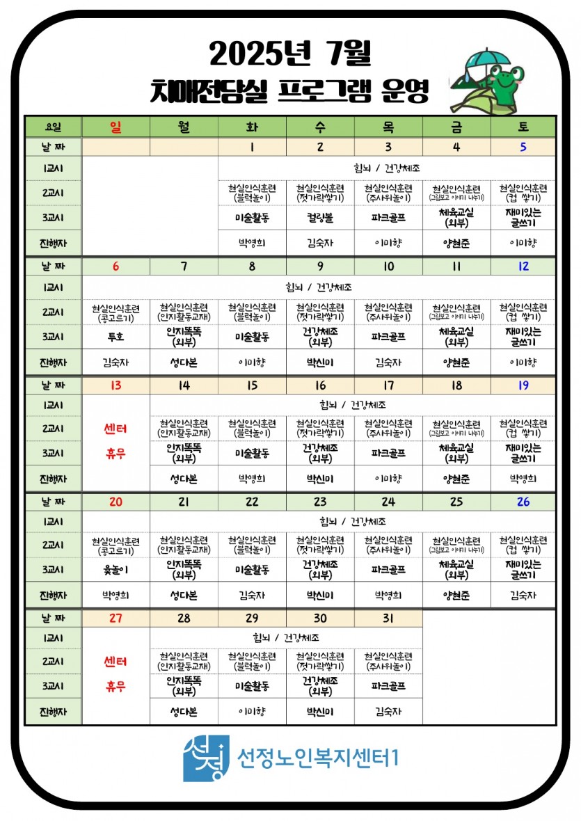2025년 7월 치매전담실 프로그램 일정표 페이지 정보 작성자 최고관리자 댓글 0건 조회 545회 작성일 25-07-01 10:48 본문 7월 프로그램 일정표 입니다. 목록 이전글2025년 7월 소식지 및 식단표 25.07.01 다음글2025년 7월 주야간보호 프로그램 일정표 25.07.01