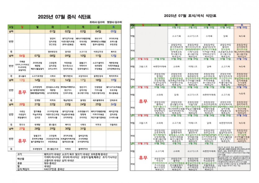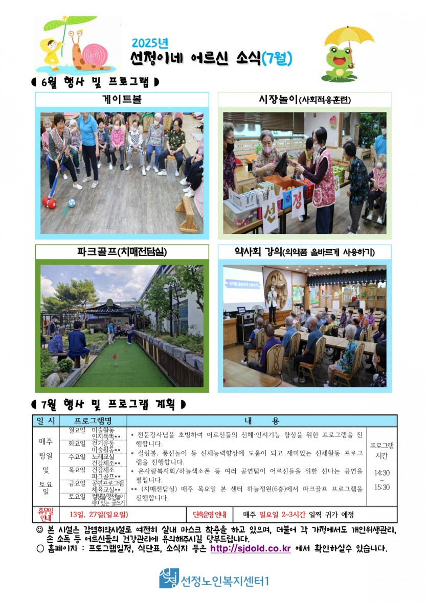2025년 7월 소식지 및 식단표 페이지 정보 작성자 최고관리자 댓글 0건 조회 556회 작성일 25-07-01 10:53 본문 7월 소식지 및 식단표 입니다. 목록 이전글2025년 8월 휴무일 안내 25.08.02 다음글2025년 7월 치매전담실 프로그램 일정표 25.07.01