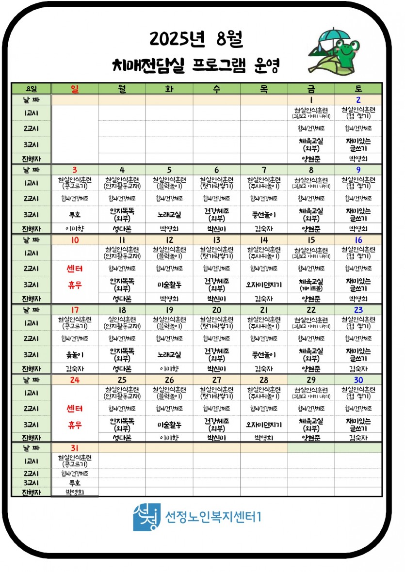 2025년 8월 치매전담실 프로그램 일정표 페이지 정보 작성자 최고관리자 댓글 0건 조회 509회 작성일 25-08-02 10:12 본문 2025년 8월 치매전담실 프로그램 일정표 입니다. 목록 이전글2025년 8월 소식지 및 식단표 25.08.02 다음글2025년 8월 주야간 프로그램 일정표 25.08.02