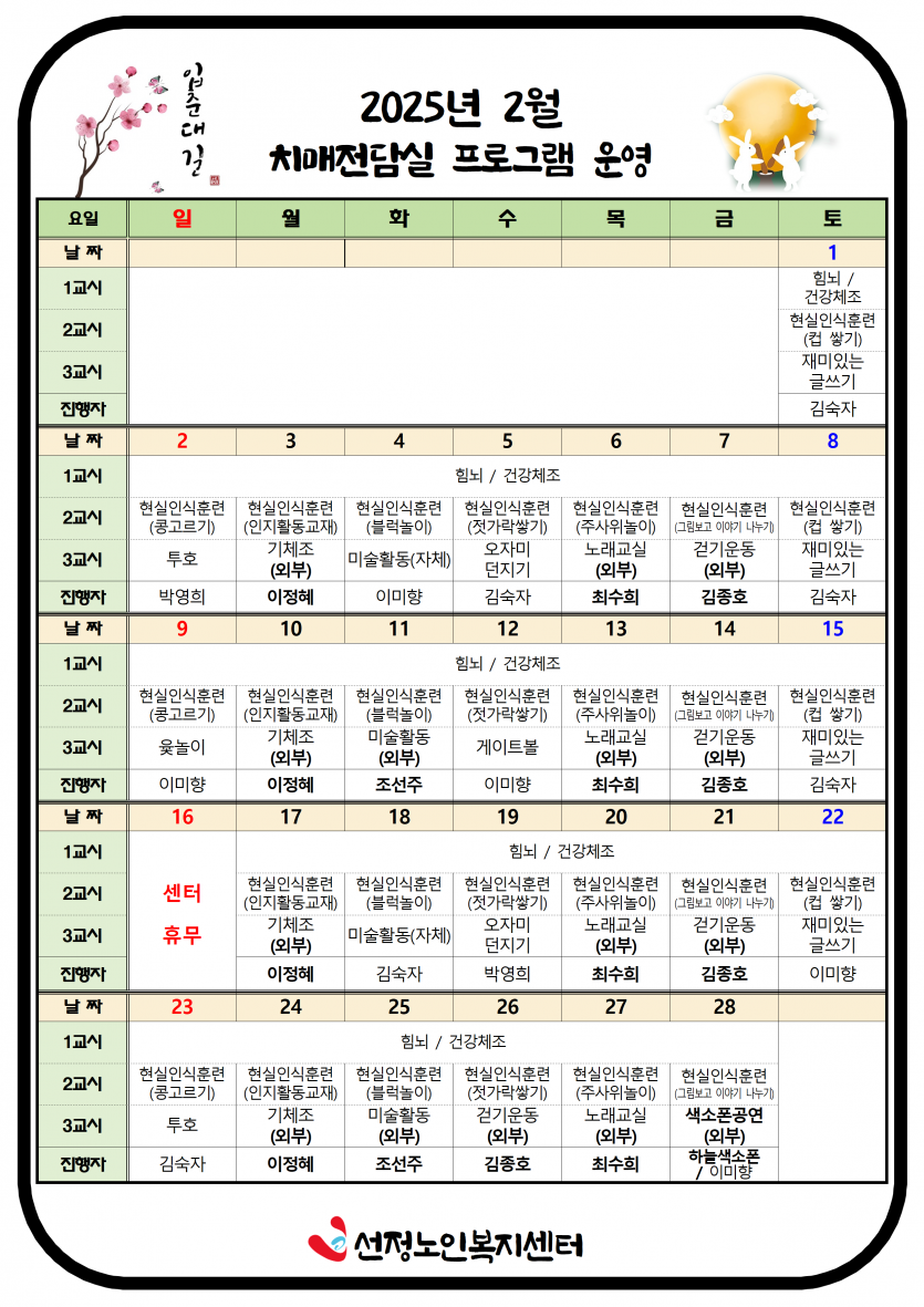 2025년 2월 치매전담실 프로그램 일정표 페이지 정보 작성자 최고관리자 댓글 0건 조회 906회 작성일 25-02-01 18:32 본문 2월 치매전담실 프로그램 일정표입니다. 목록 이전글2025년 2월 소식지 및 식단표 25.02.01 다음글2025년 2월 주야간보호 프로그램 일정표 25.02.01