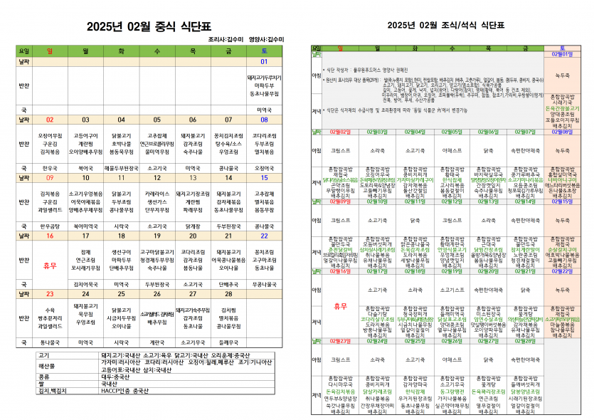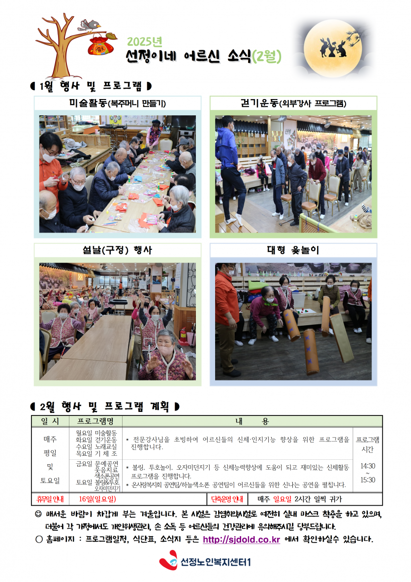 2025년 2월 소식지 및 식단표 페이지 정보 작성자 최고관리자 댓글 0건 조회 912회 작성일 25-02-01 18:33 본문 2월 소식지 및 식단표 입니다. 목록 이전글2025년 3월 휴무일 안내 25.02.28 다음글2025년 2월 치매전담실 프로그램 일정표 25.02.01