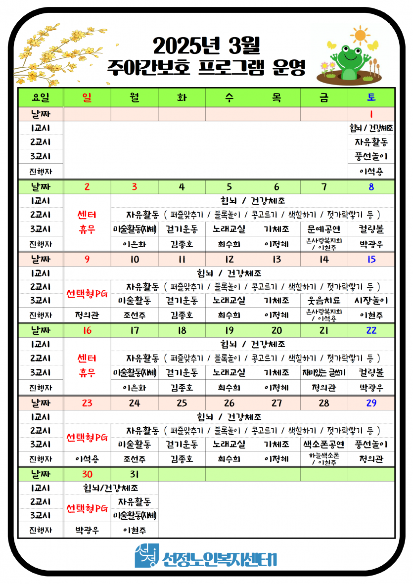 2025년 3월 주야간보호 프로그램 일정표 페이지 정보 작성자 최고관리자 댓글 0건 조회 747회 작성일 25-02-28 18:29 본문 3월 주야간보호 프로그램 일정표 입니다. 목록 이전글2025년 3월 치매전담실 프로그램 일정표 25.02.28 다음글2025년 3월 휴무일 안내 25.02.28