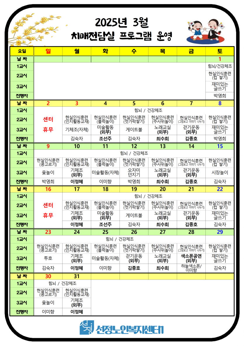 2025년 3월 치매전담실 프로그램 일정표 페이지 정보 작성자 최고관리자 댓글 0건 조회 742회 작성일 25-02-28 18:30 본문 3월 치매전담실 프로그램 일정표입니다. 목록 이전글2025년 3월 소식지 및 식단표 25.02.28 다음글2025년 3월 주야간보호 프로그램 일정표 25.02.28