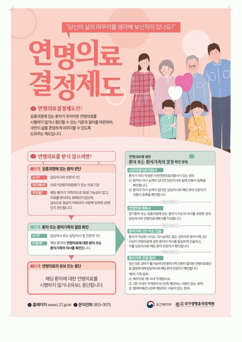 * 연명의료란 임종 과정에 있는 환자에게 하는 의학적 시술 중, 치료 효과 없이 임종 과정의 기간만을 연장하는 것을 말합니다.