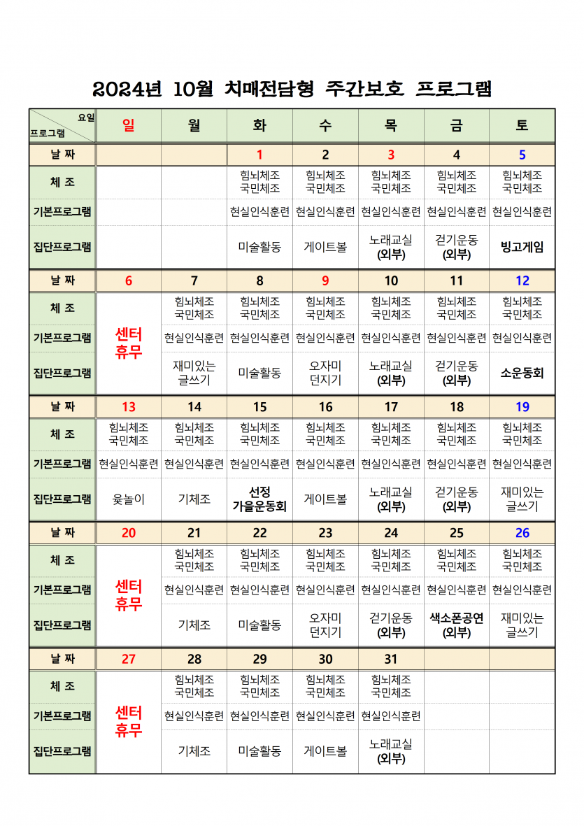 2024년 10월 치매전담실 프로그램 일정표 페이지 정보 작성자 최고관리자 댓글 0건 조회 1,524회 작성일 24-09-27 16:42 본문 10월 치매전담실 프로그램 일정표 입니다. 목록 이전글2024년 11월 휴무일 안내 24.10.31 다음글2024년 10월 주야간보호 프로그램 일정표 24.09.27