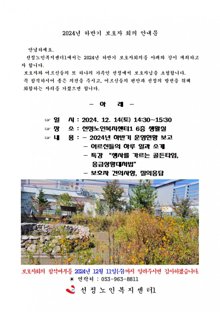 선정노인복지센터1에서는 2024년 하반기 보호자회의를 아래와 같이 개최하고자 합니다.