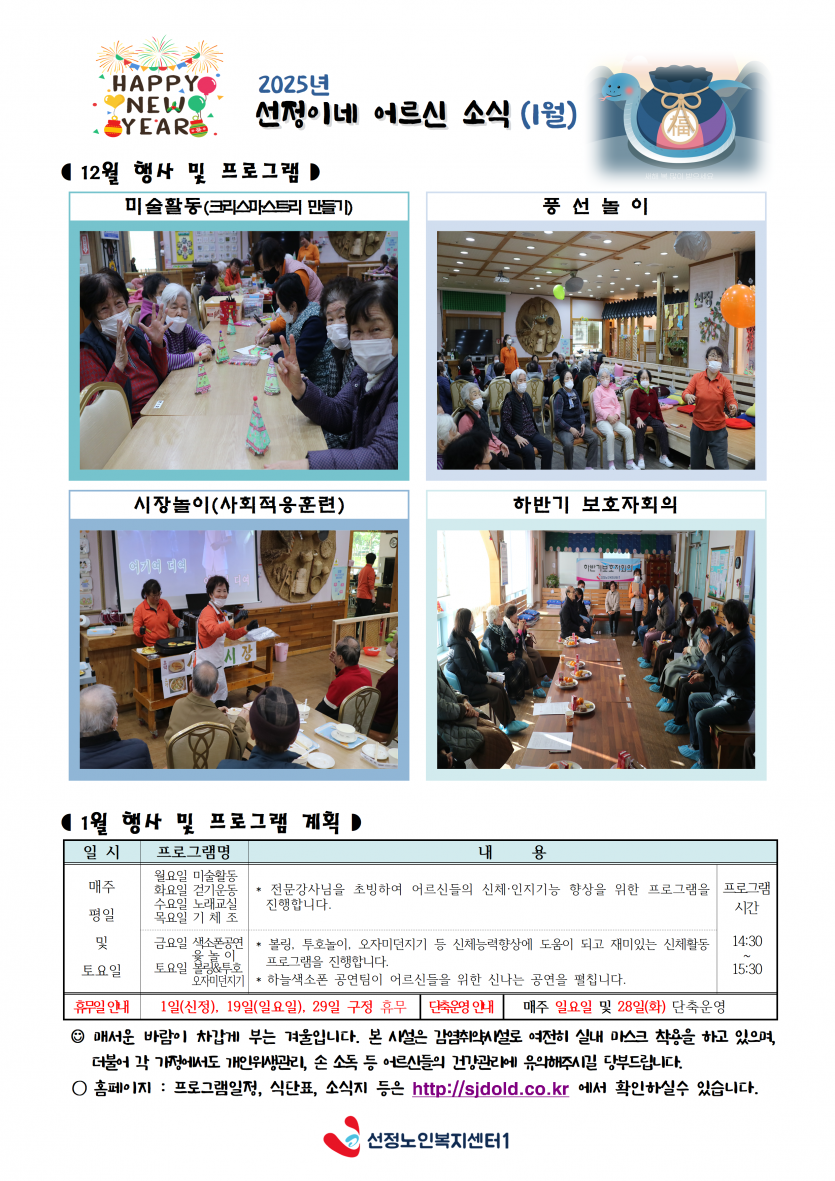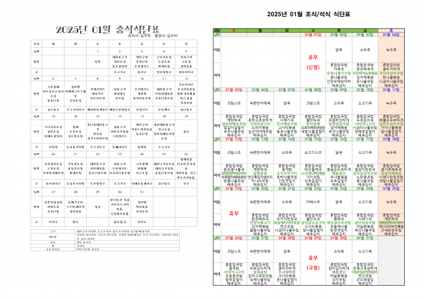 2025년 1월 소식지 및 식단표 페이지 정보 작성자 최고관리자 댓글 0건 조회 1,016회 작성일 24-12-31 18:37 본문 2025년 1월 소식지 및 식단표 입니다. 목록 이전글2025년 1월 주야간보호 프로그램 일정표 24.12.31 다음글2025년 1월 휴무일 안내 24.12.31