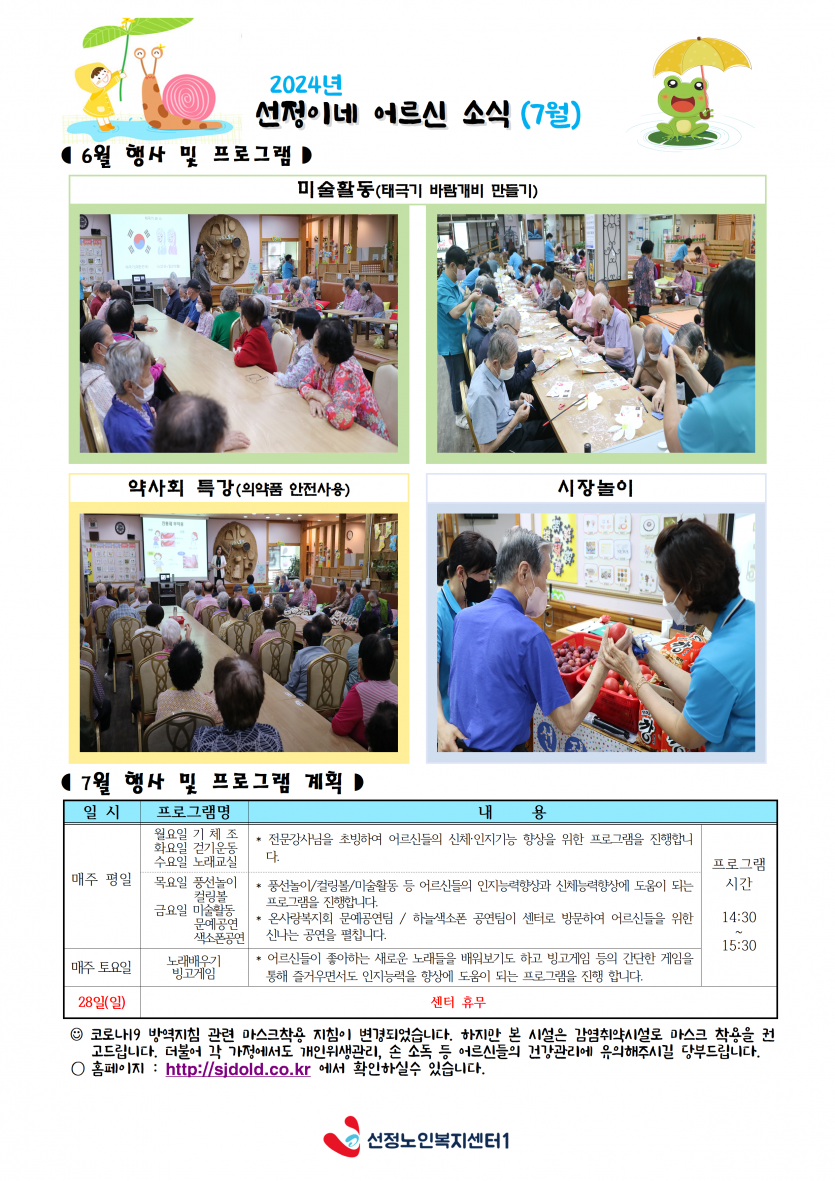 2024년 7월 소식지 및 식단표 페이지 정보 작성자 최고관리자 댓글 0건 조회 2,353회 작성일 24-07-01 16:48 본문 소식지 및 식단표 입니다. 목록 이전글2024년 7월 주야간보호 프로그램 일정표 24.07.01 다음글2024년 7월 휴무일 안내 24.07.01