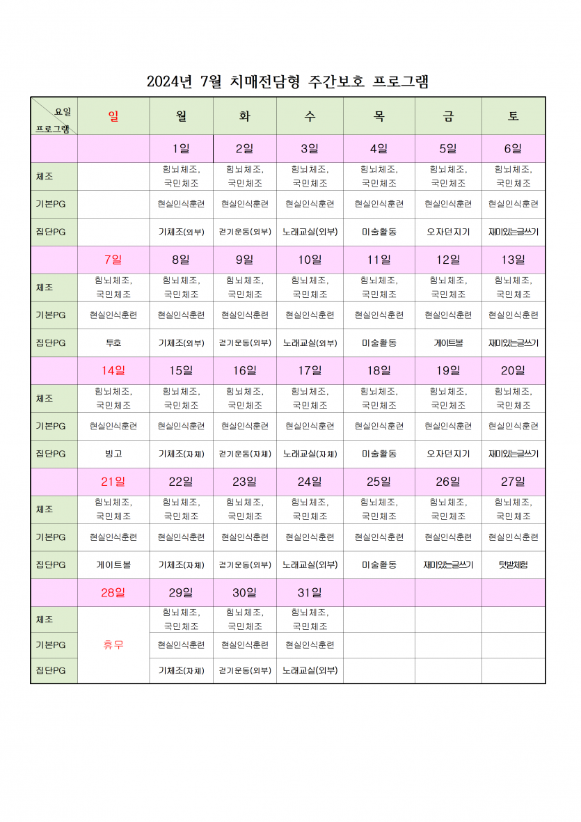 2024년 7월 치매전담실 프로그램 일정표 페이지 정보 작성자 최고관리자 댓글 0건 조회 2,210회 작성일 24-07-02 11:13 본문 치매전담실 프로그램 일정표 입니다. 목록 이전글2024년 8월 휴무일 안내 24.08.01 다음글2024년 7월 주야간보호 프로그램 일정표 24.07.01