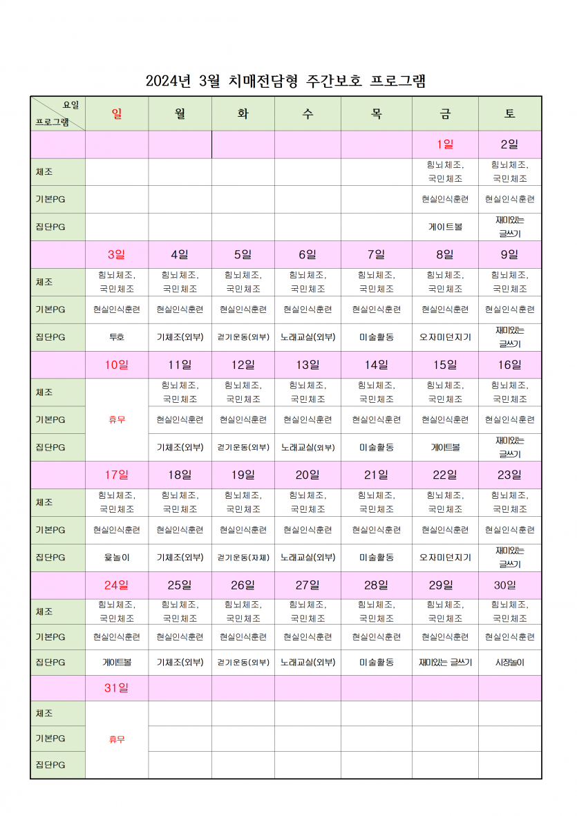 2024년 3월 치매전담실 프로그램 일정표 페이지 정보 작성자 최고관리자 댓글 0건 조회 2,407회 작성일 24-03-06 09:55 본문 3월 프로그램 일정표입니다. 목록 이전글2024년 4월 휴무일 안내 24.04.01 다음글2024년 3월 주야간보호 프로그램 일정표 24.03.06