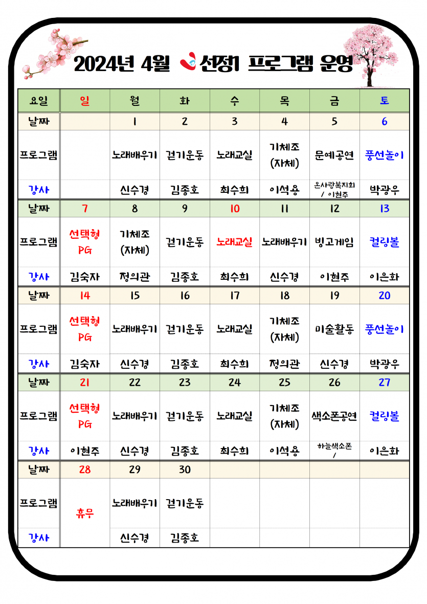 2024년 4월 주야간보호 프로그램 일정표 페이지 정보 작성자 최고관리자 댓글 0건 조회 2,444회 작성일 24-04-01 10:30 본문 4월 프로그램 일정표입니다. 목록 이전글2024년 4월 치매전담실 프로그램 일정표 24.04.05 다음글2024년 4월 소식지 및 식단표 24.04.01