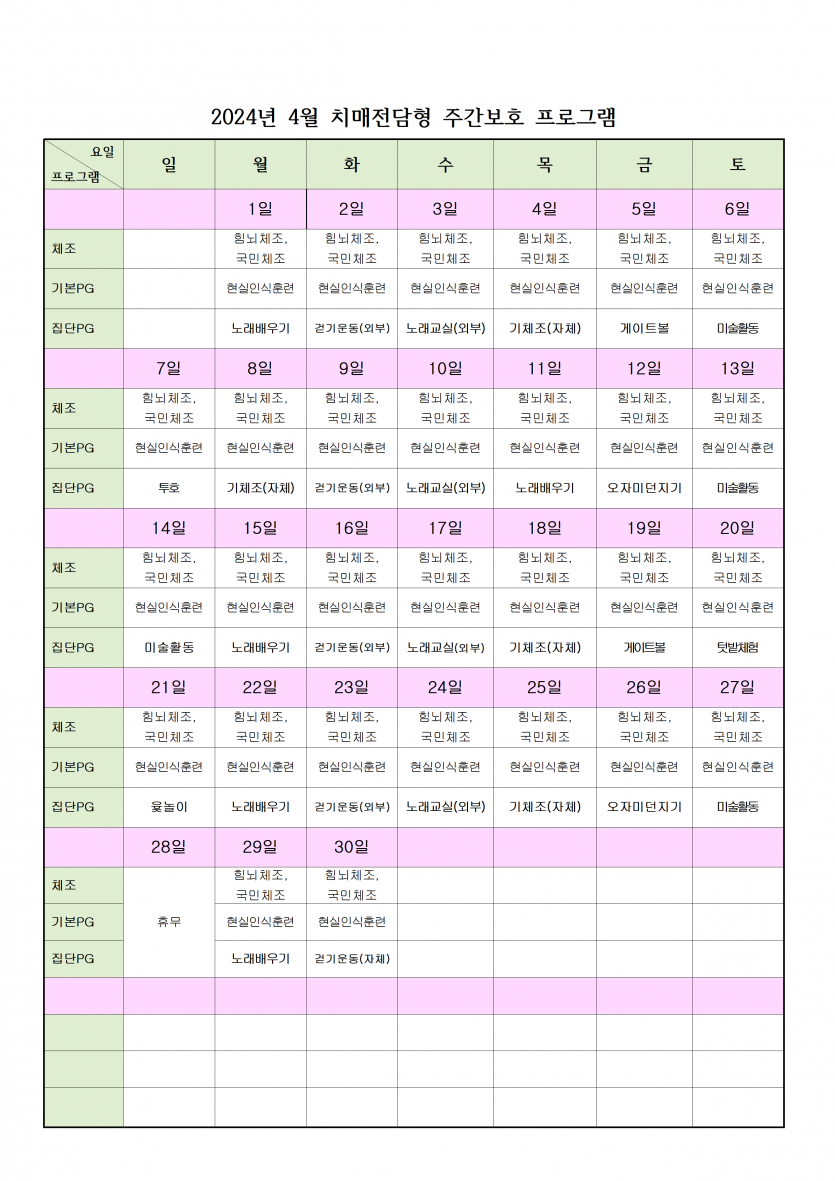 2024년 4월 치매전담실 프로그램 일정표 페이지 정보 작성자 최고관리자 댓글 0건 조회 2,463회 작성일 24-04-05 19:01 본문 치매전담실 프로그램 일정표입니다. 목록 이전글2024년 5월 휴무일 안내 24.04.30 다음글2024년 4월 주야간보호 프로그램 일정표 24.04.01