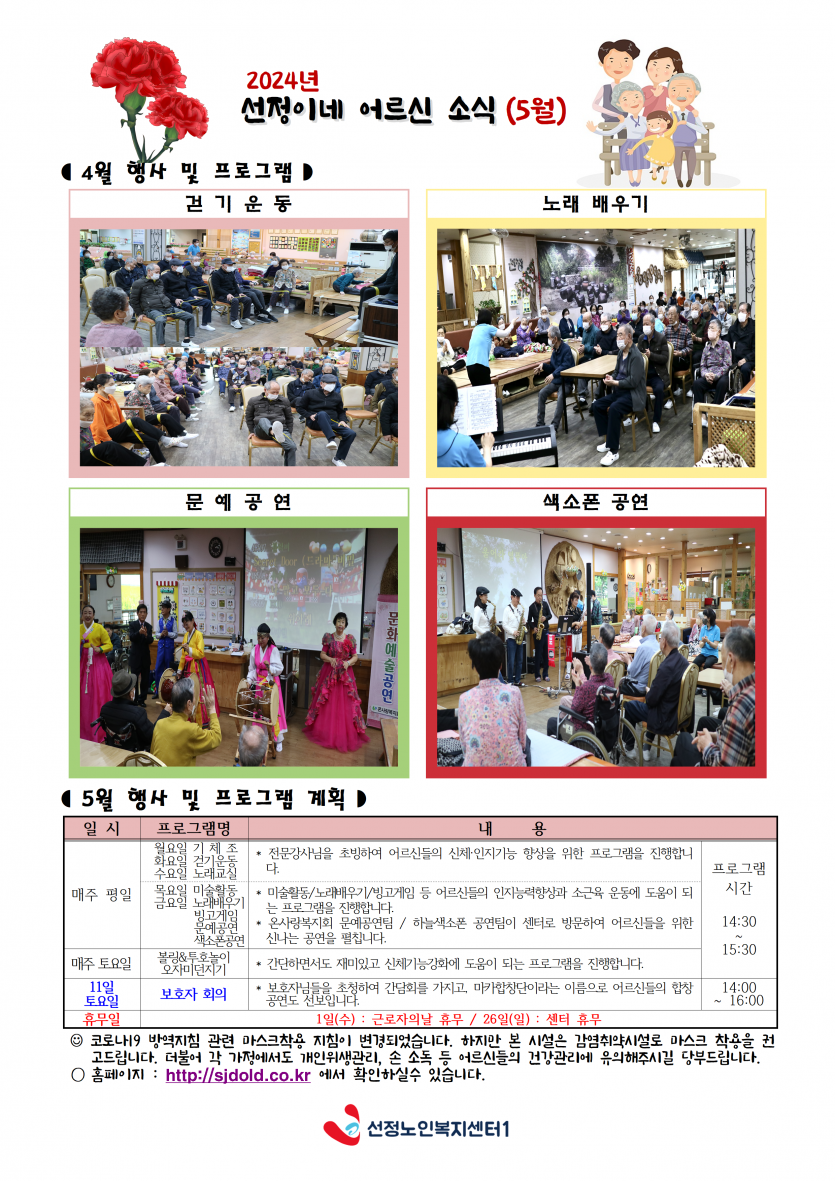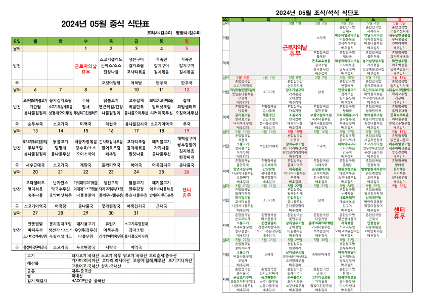 2024년 5월 소식지 및 식단표 페이지 정보 작성자 최고관리자 댓글 0건 조회 2,371회 작성일 24-05-04 15:54 본문 소식지 및 식단표 입니다. 목록 이전글2024년 5월 주야간보호 프로그램 일정표 24.05.04 다음글2024년 5월 휴무일 안내 24.04.30