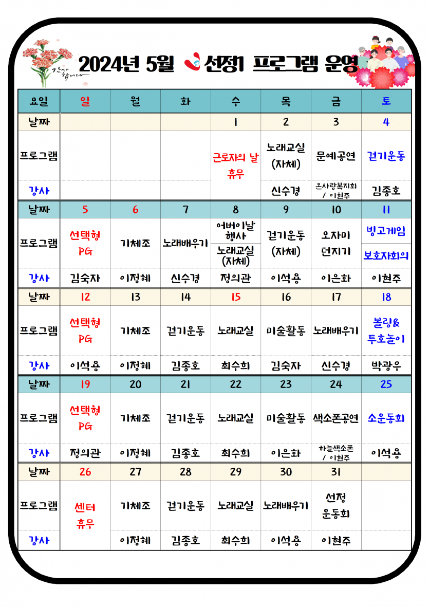 2024년 5월 주야간보호 프로그램 일정표 페이지 정보 작성자 최고관리자 댓글 0건 조회 2,357회 작성일 24-05-04 16:07 본문 5월 주야간보호 프로그램 일정표입니다. 목록 이전글2024년 5월 치매전담실 프로그램 일정표 24.05.07 다음글2024년 5월 소식지 및 식단표 24.05.04