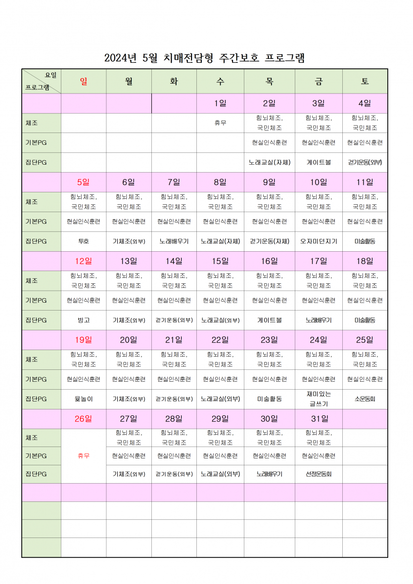 2024년 5월 치매전담실 프로그램 일정표 페이지 정보 작성자 최고관리자 댓글 0건 조회 2,405회 작성일 24-05-07 12:07 본문 치매전담실 프로그램 일정표 입니다. 목록 이전글◆ 5월 11일 (토) ◆ 2024년도 상반기 보호자 회의를 개최합니다. 24.05.07 다음글2024년 5월 주야간보호 프로그램 일정표 24.05.04